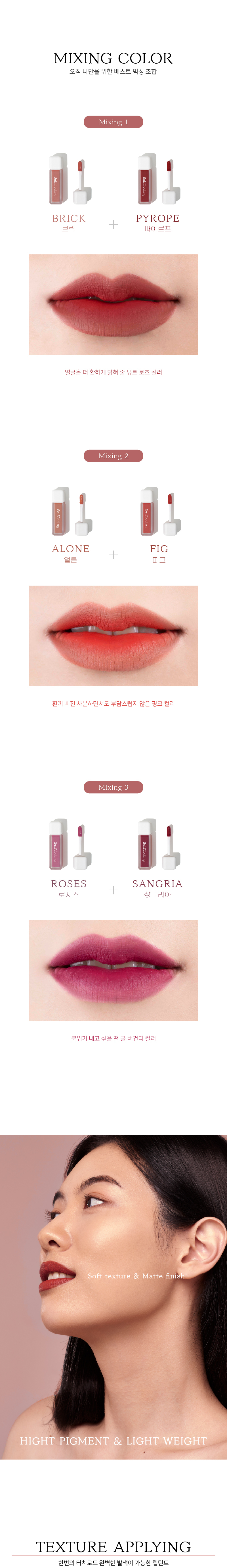 Pigment with rich color development maintains the same color as it is applied for a long time. A matte matte finish with a liquid texture creates vivid and clear lips without stains as if it soaks into the lips.